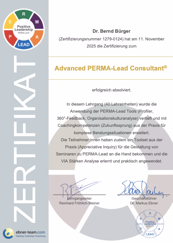Juhuuu, nach drei tollen Tagen, mit tollen Coaches, die Kennenlernen und Erleben neuer Methoden, einer Transferaufgabe und einem wirklich gelungenen Debriefing bin ich frisch gebackener Advanced PERMA-Lead® Constultant.